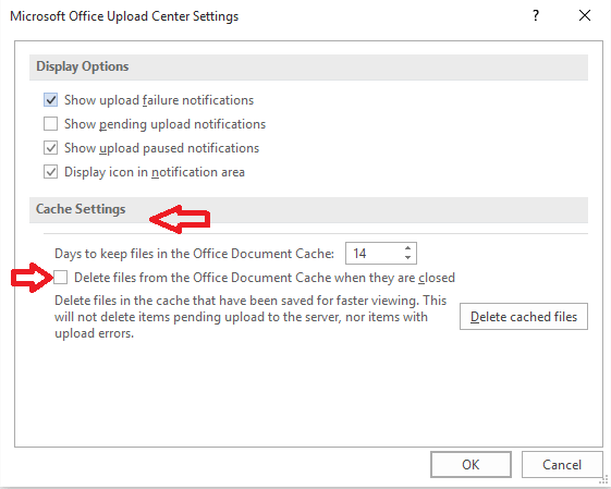 - Debajo de Caché, la configuración selecciona Eliminar archivos de la caché de documentos de Office cuando están cerrados